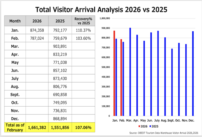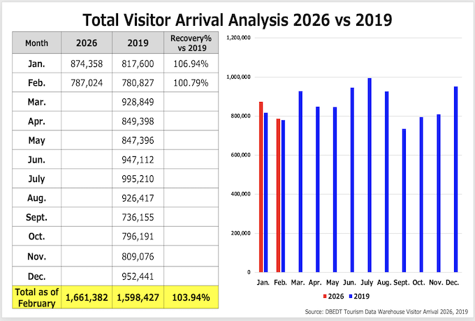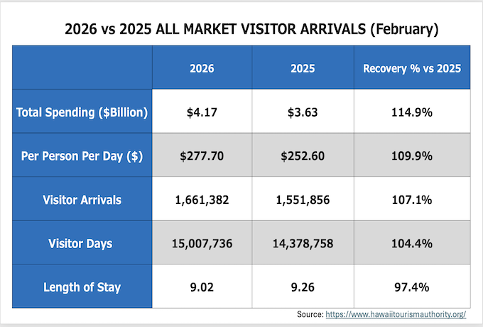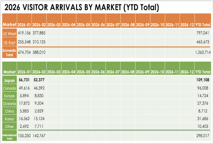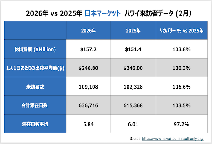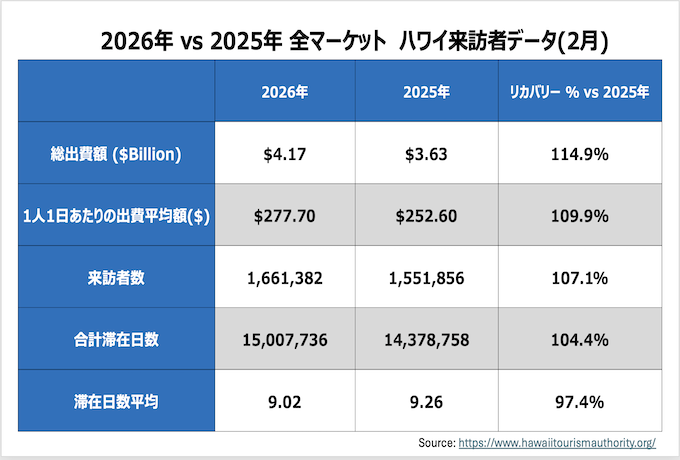 2026年2月にハワイへ訪問した全渡航者数はハワイ州産業経済開発観光局(DBEDT)とハワイ・ツーリズム・オーソリティによると、 787,024人となりました。(内クルーズ利用は26,234人)