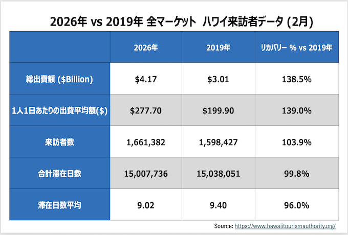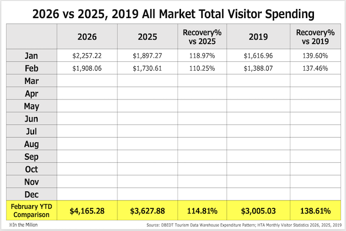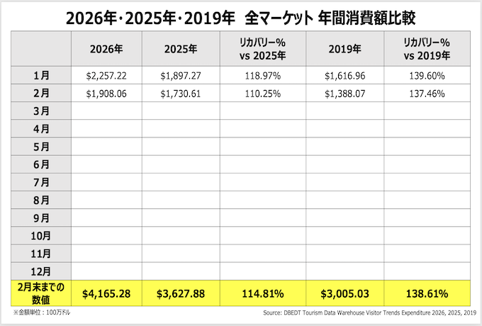 2026年2月の全渡航者による消費額は19億1,000ドル (2019年対比37.4%増, 2025年対比10.3%増)となりました。