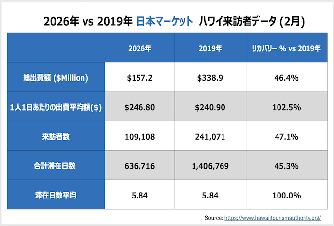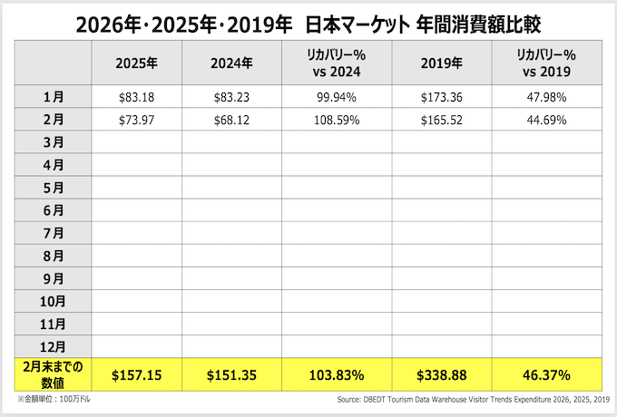 渡航者による1日あたりの消費額は2月単月で、平均1人1日当たり279ドル (2019年対比38.8%増, 2025年対比8.6%増)