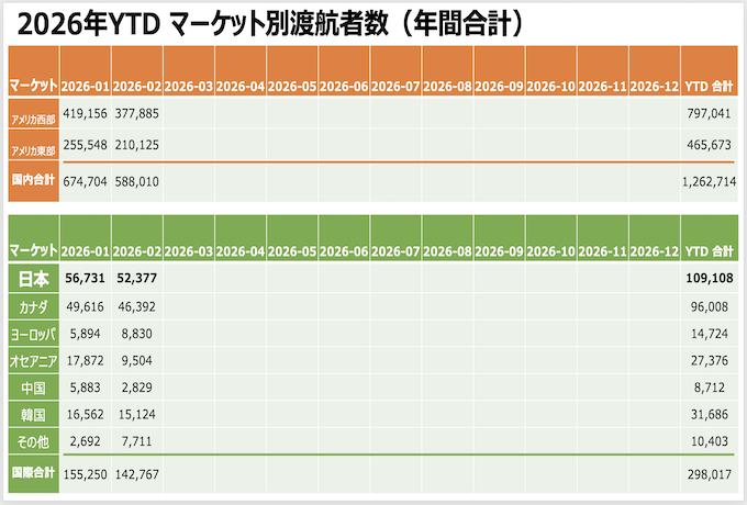 ・アメリカ西部渡航者数: 377,885人 (2019年対比21.0%増, 2025年対比1.9%増)