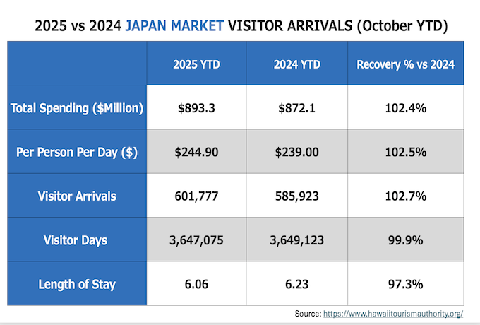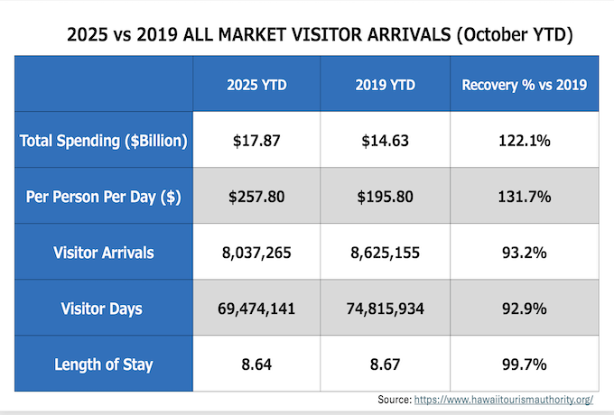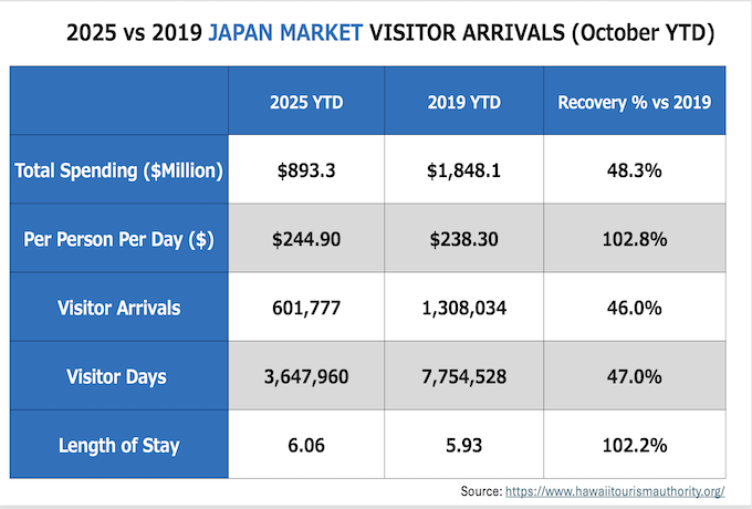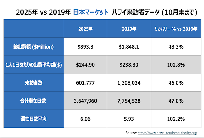 ・ハワイへの全渡航者数:749,095人 (2019年対比5.9%減, 2024年対比2.9%減)