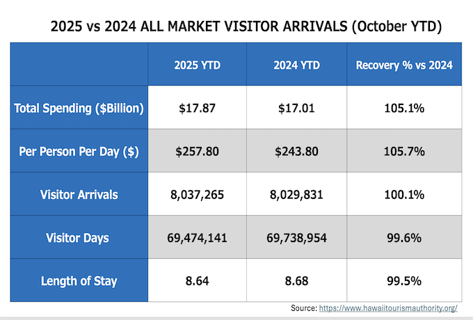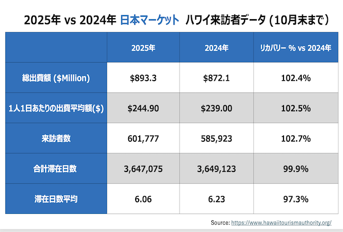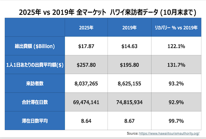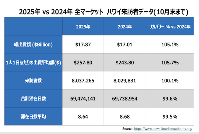 2025年10月にハワイへ訪問した全渡航者数はハワイ州産業経済開発観光局(DBEDT)とハワイ・ツーリズム・オーソリティによると、749,095人となりました。(内クルーズ利用は35,616人)