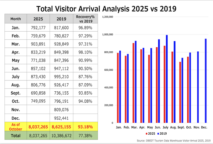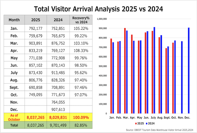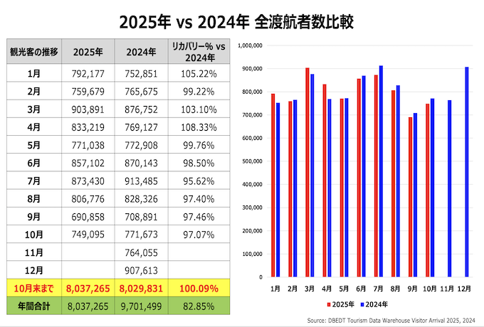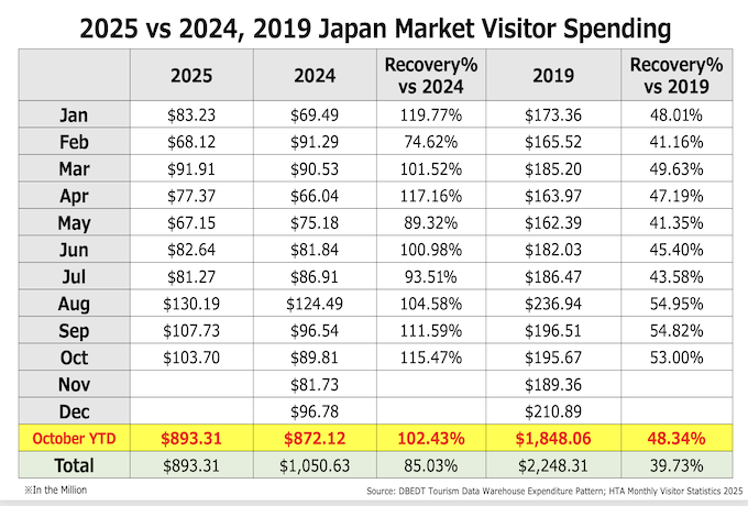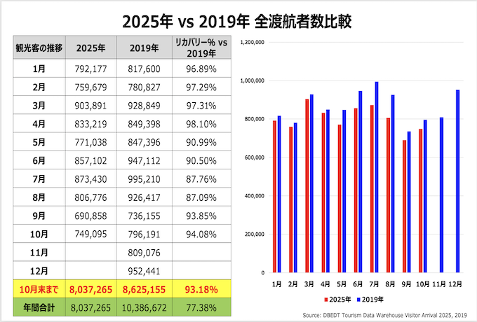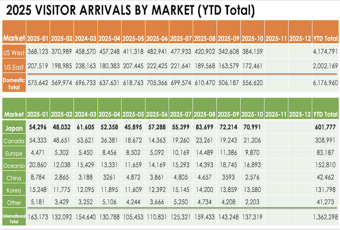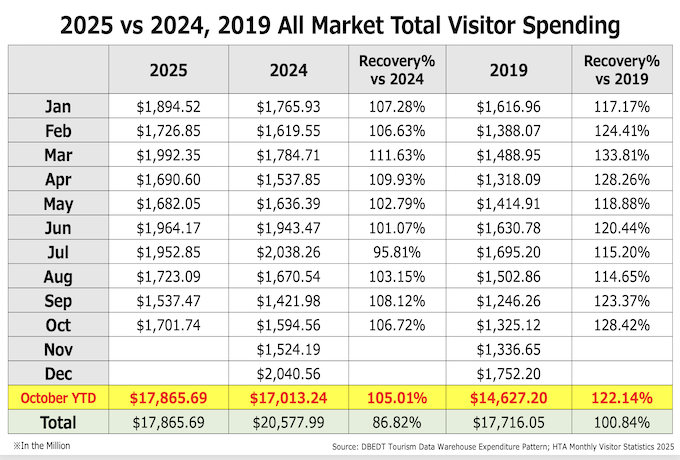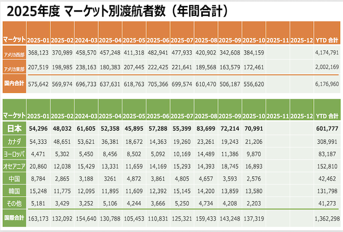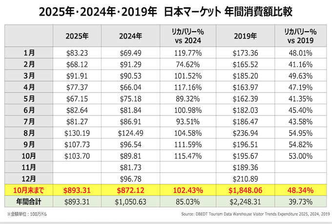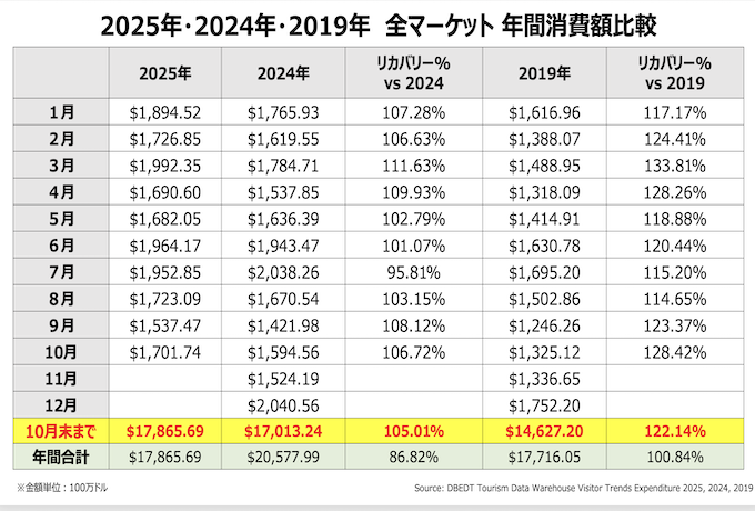 2025年10月の全渡航者による消費額は17億ドル (2019年対比28.4%増, 2024年対比6.7%増)となりました。