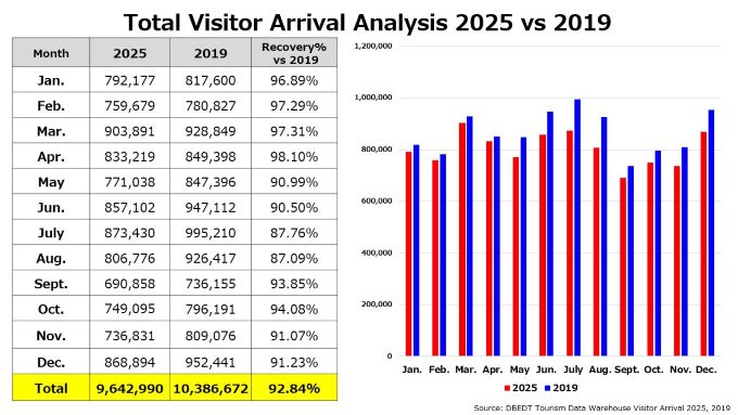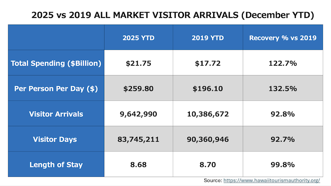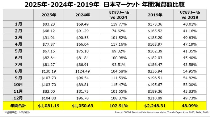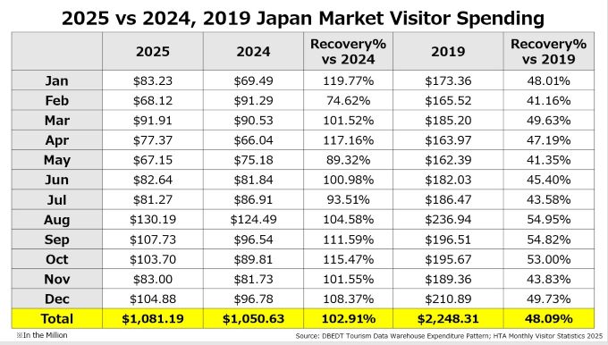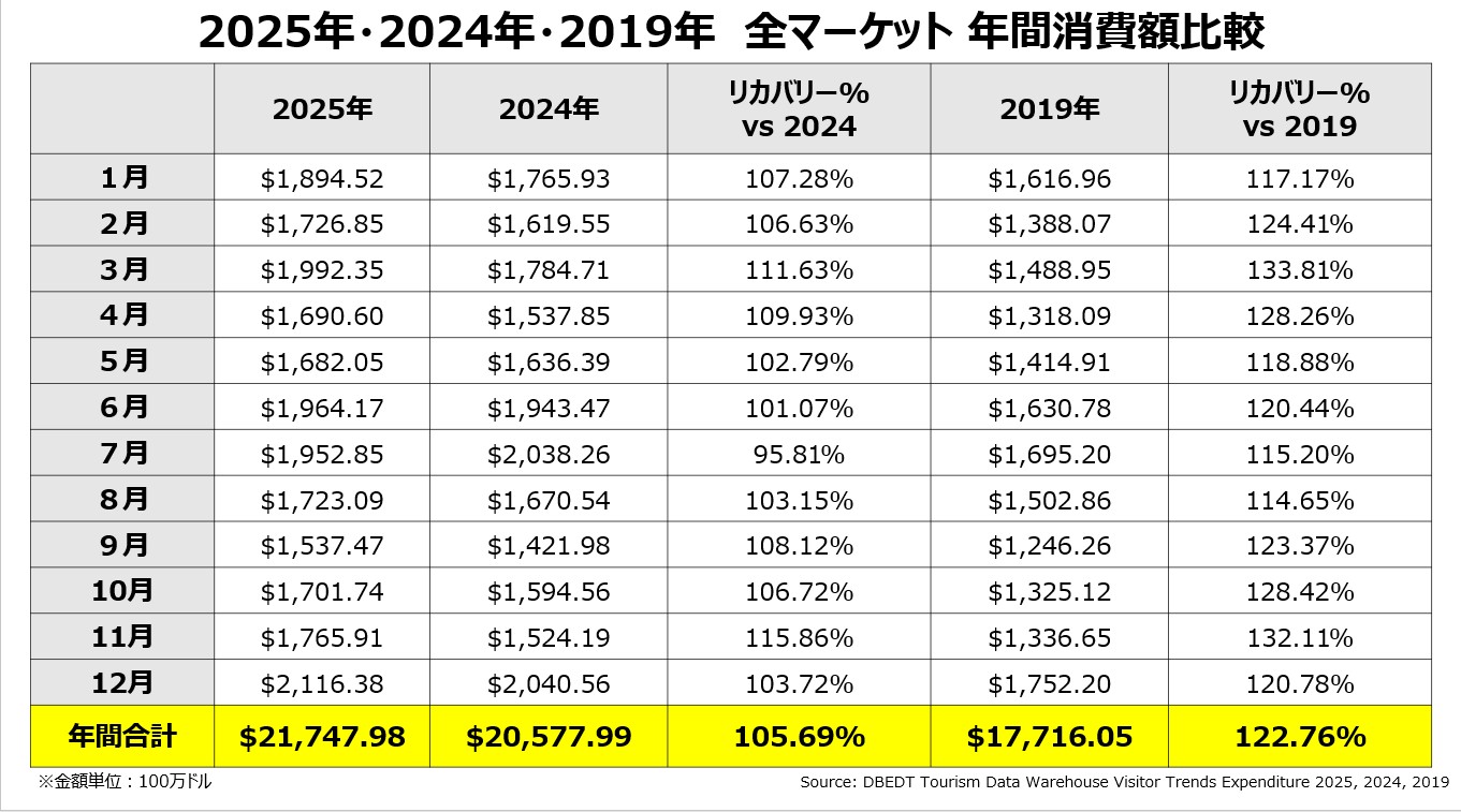 2025年12月の全渡航者による消費額は21億2,000万ドル (2019年対比21.0%増, 2024年対比3.7%増)となりました。