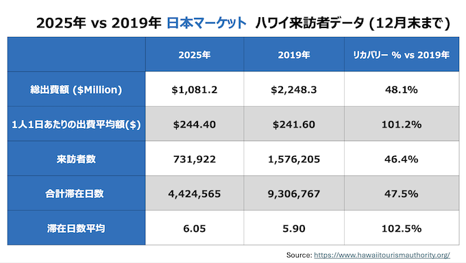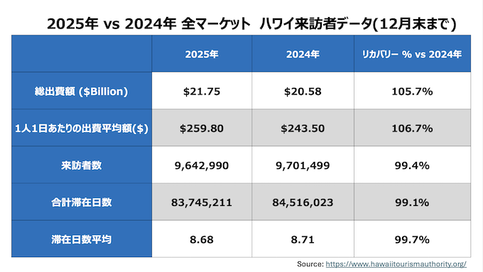 ・ハワイへの全渡航者数:868,894人 (2019年対比8.8%減, 2024年対比4.3%減)
