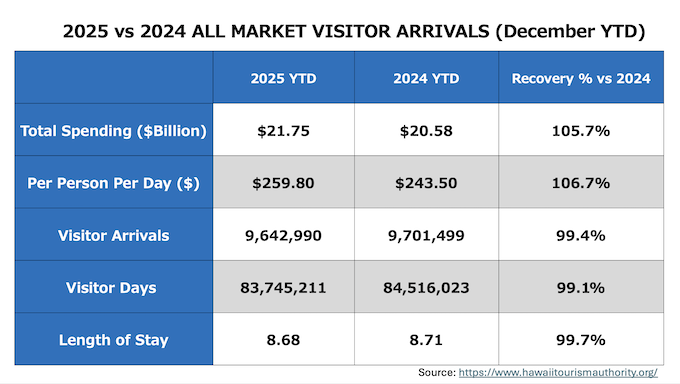 2025年12月にハワイへ訪問した全渡航者数はハワイ州産業経済開発観光局(DBEDT)とハワイ・ツーリズム・オーソリティによると、868,894人となりました。(内クルーズ利用は18,631人)