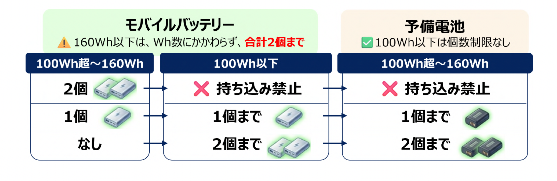 ・機内持込み可能なモバイルバッテリーは最大2個まで(1個あたり160Wh以下)