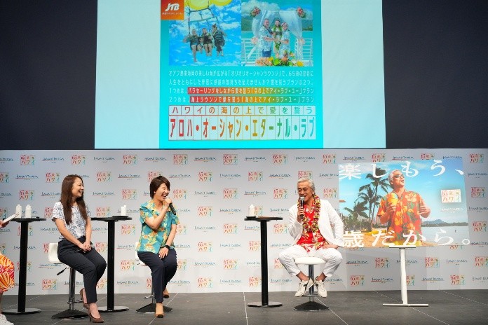 また、賛同企業を代表してJTBの担当者からは、シニア世代の人生の節目を祝う具体的な旅行プランとしてハワイの海の上で愛を誓う「アロハ・オーシャン・エターナル・ラブ」が紹介されました。担当者は「ハワイの青い海と空の間で、これまでの感謝を伝え合う。そんな一生の思い出に残るような、アクティブかつ感動的な体験をご提案したい」と、シニア層の知的好奇心と挑戦心を刺激するプランへの想いをコメント。これを受け、寺島さんも「今までお互いありがとうと言いづらかった夫婦にも、このプランを機に素直に感謝できそうだよね」と、新しいお祝いの形に深い関心を示していました。