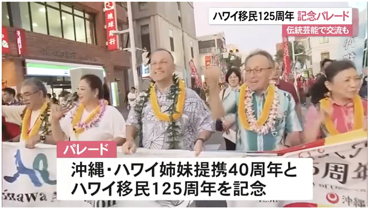 10月11日、沖縄からのハワイ移民125周年を祝うパレードが那覇市で行われました。 パレードには、ハワイ州のジョシュ・グリーン知事、沖縄県の玉城知事のほか、沖縄にゆかりのある日系人などが参加しました。特設ステージではフラやエイサーが披露され、交流を深めました。ニュースの映像はこちらで視聴できます。