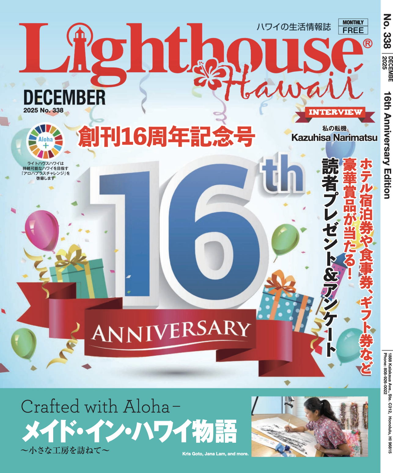 2025年12月号で創刊16周年を迎えたハワイの生活情報誌「ライトハウスハワイ」。その記念号では、ハワイの工房で丁寧に作られる真の手作り”メイド・イン・ハワイ”を特集しています。アーティストのクリス・ゴトウ、手作りのグルメキャラメルが人気の「スイート・ブラウン・ハワイ・キャラメル」など、こだわりのブランドストーリーが紹介されています。
