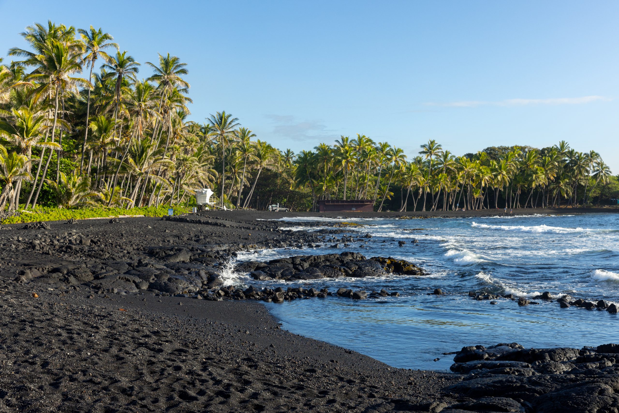 ハワイ島ならではの黒砂が美しい、プナルウ黒砂海岸。海岸で日光浴をするホヌに出会えるかもしれません。また、隣接するキャンプ場では、ローカルの人々がキャンプや釣りを楽しむ様子が見られます。