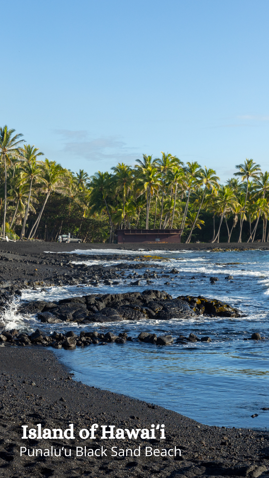 ハワイ島ならではの黒砂が美しい、プナルウ黒砂海岸。海岸で日光浴をするホヌに出会えるかもしれません。また、隣接するキャンプ場では、ローカルの人々がキャンプや釣りを楽しむ様子が見られます。