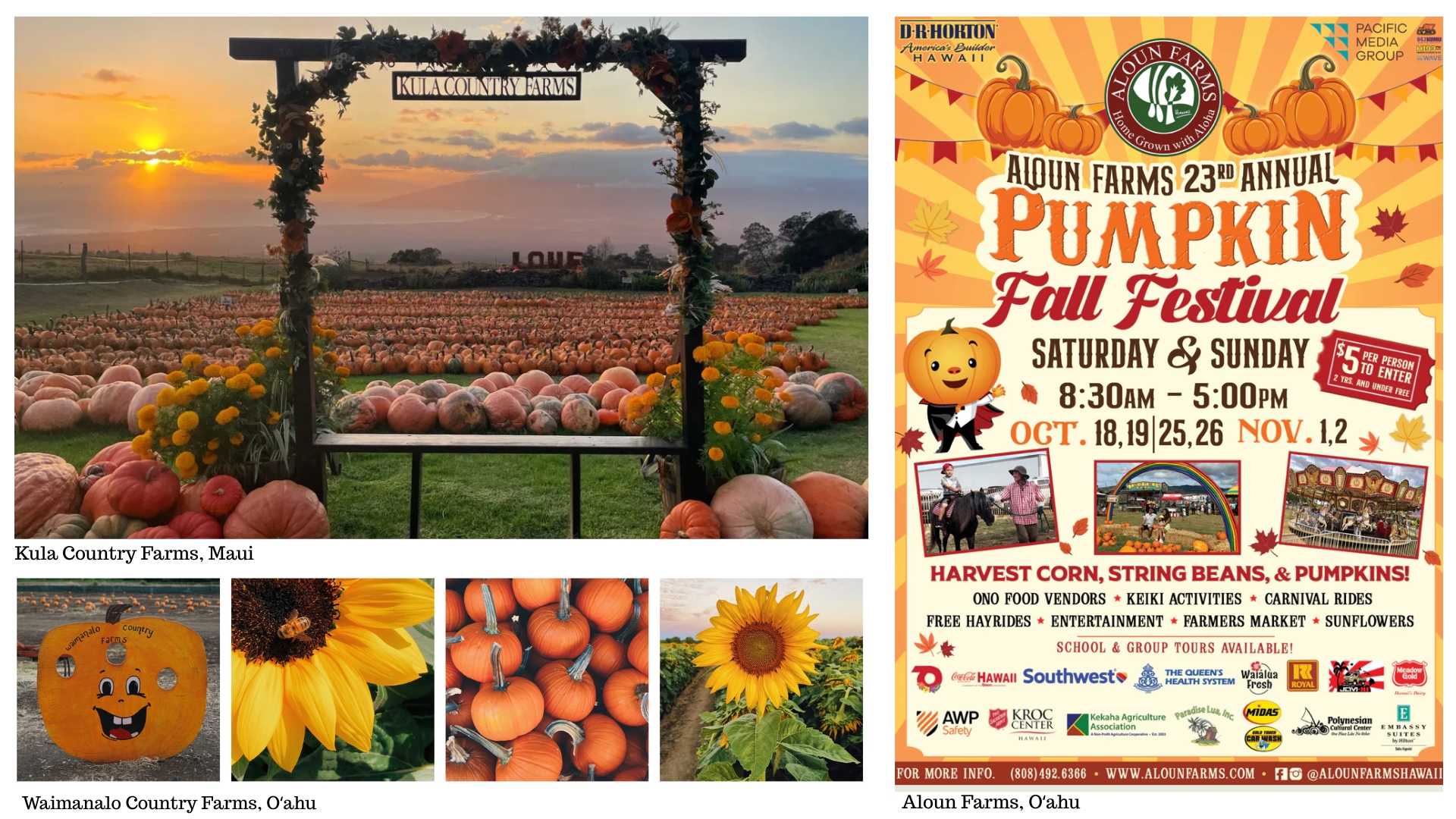 今月は、オアフ島東部のワイマナロ・カントリー・ファーム、西部のアロウン・ファーム、マウイ島のクラ・カントリー・ファームなどで、パンプキン畑でカボチャを選んだり、カントリーストアで買い物を楽しんだり‥‥。ビーチでのアクティビティとは一味違う、この時期限定のハワイの楽しみ方です。開催期間や時間などは各サイトでご確認ください。