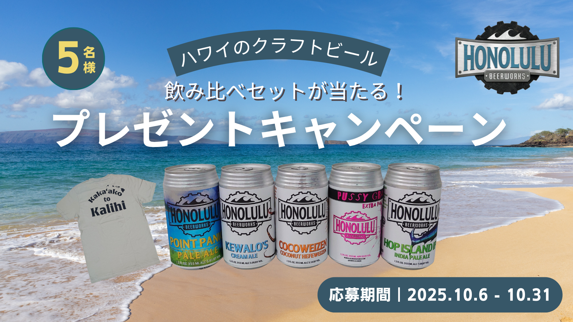 ハワイ州観光局公式インスタグラム(@gohawaii_jp)では、オアフ島の人気ブリュワリー「ホノルルビアワークス」の飲み比べセットとオリジナルTシャツが当たるプレゼントキャンペーンを実施しています。