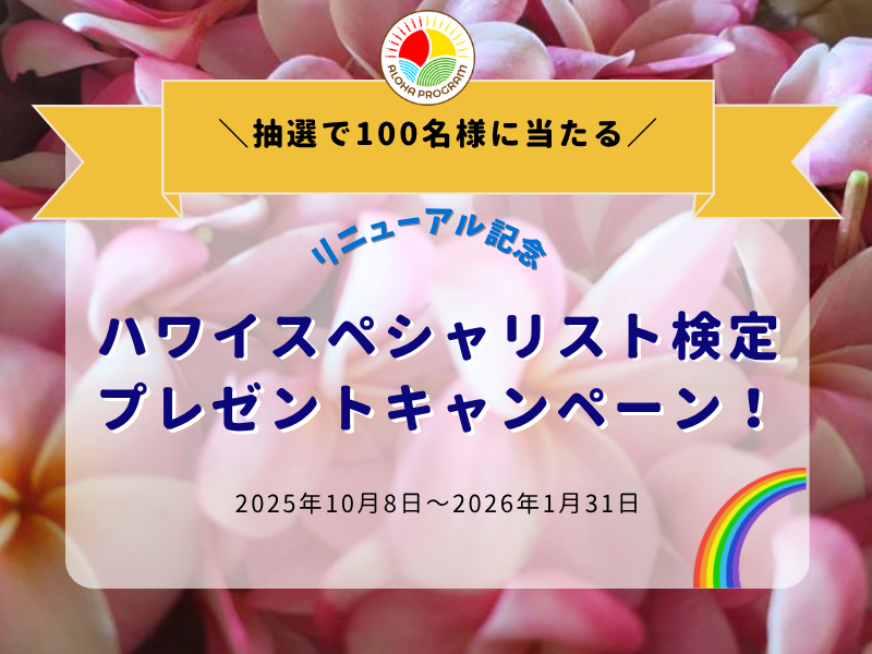 2025年10月8日より、ハワイ州観光局公式ラーニングサイト「アロハプログラム」のハワイスペシャリスト検定がリニューアルいたしました。これを記念して、抽選で100名様にハワイグッズが当たるプレゼントキャンペーンを実施中!ぜひ、この機会にハワイスペシャリスト検定に挑戦してみませんか?