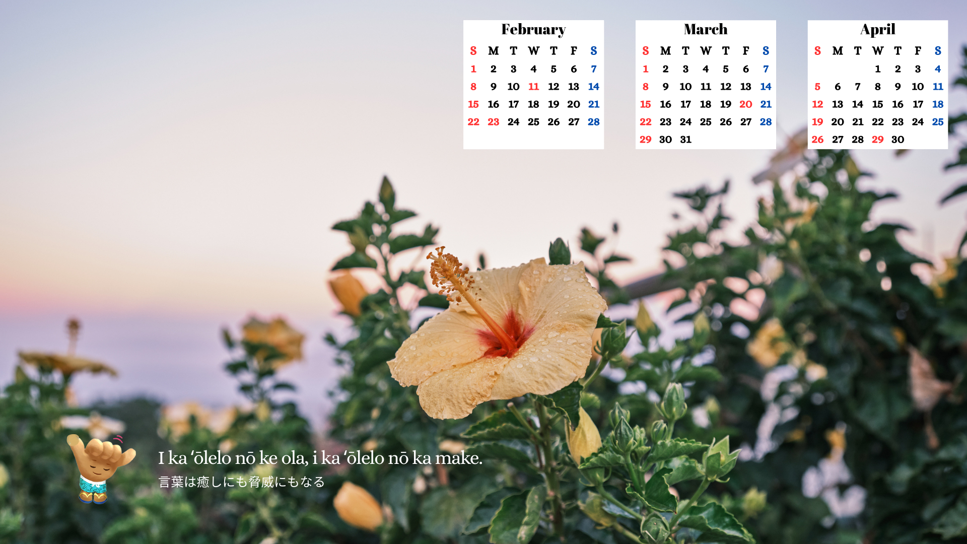 2026年の壁紙カレンダーのテーマはʻŌlelo Hawaiʻi(ハワイ語)。