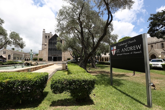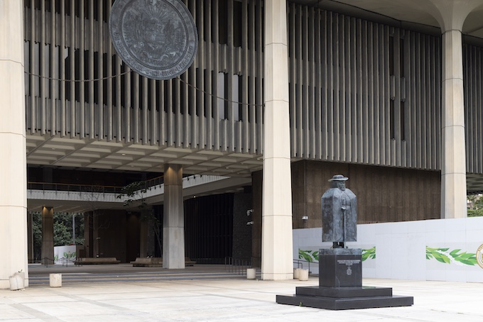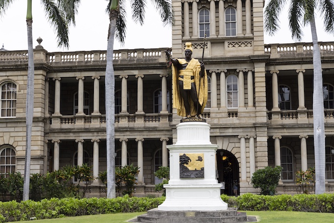 開放的な設計が特徴の州政庁前には、ハンセン病患者に尽くしたダミアン神父の像が立ちます。ハワイの現代と人道の歴史が交差するスポットです。