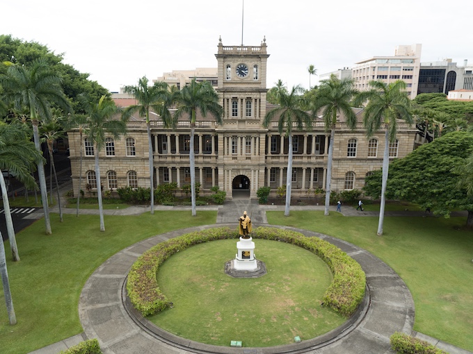 カメハメハ大王像が目の前に立ち、ハワイ州最高裁判所が入る歴史的建築。ドラマのロケ地としても知られ、宮殿の正面に位置する重要なランドマークです。(土・日は館内に入れません)