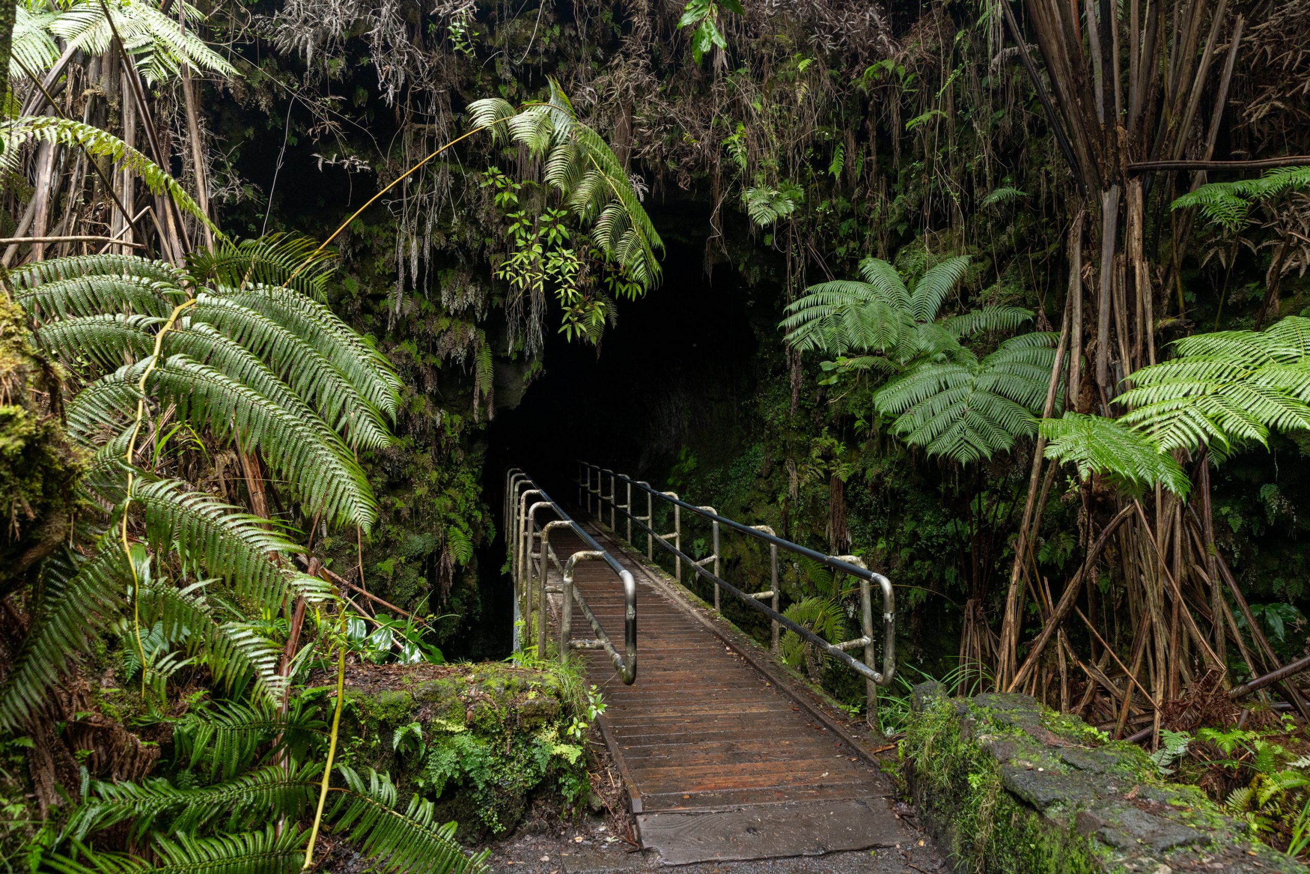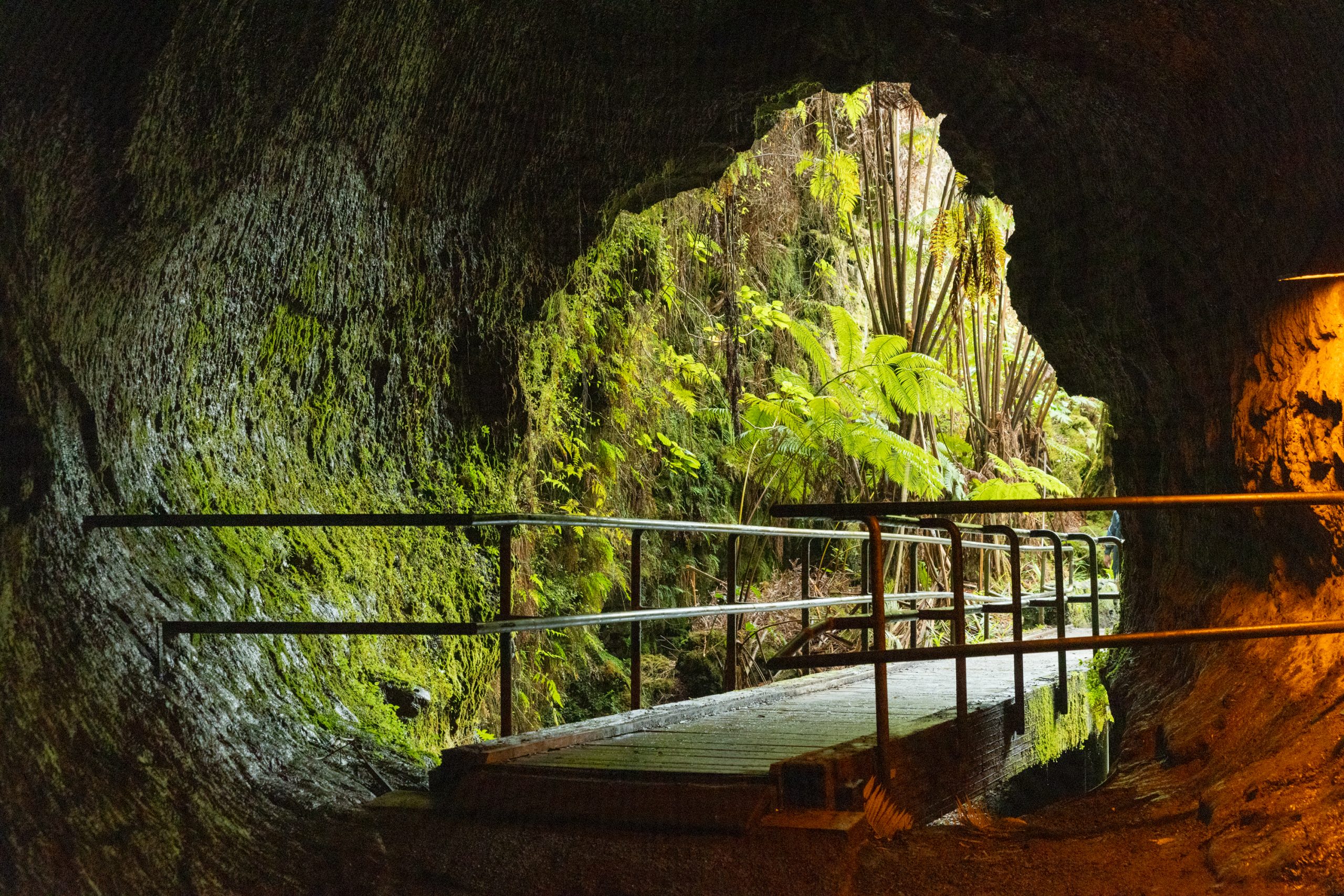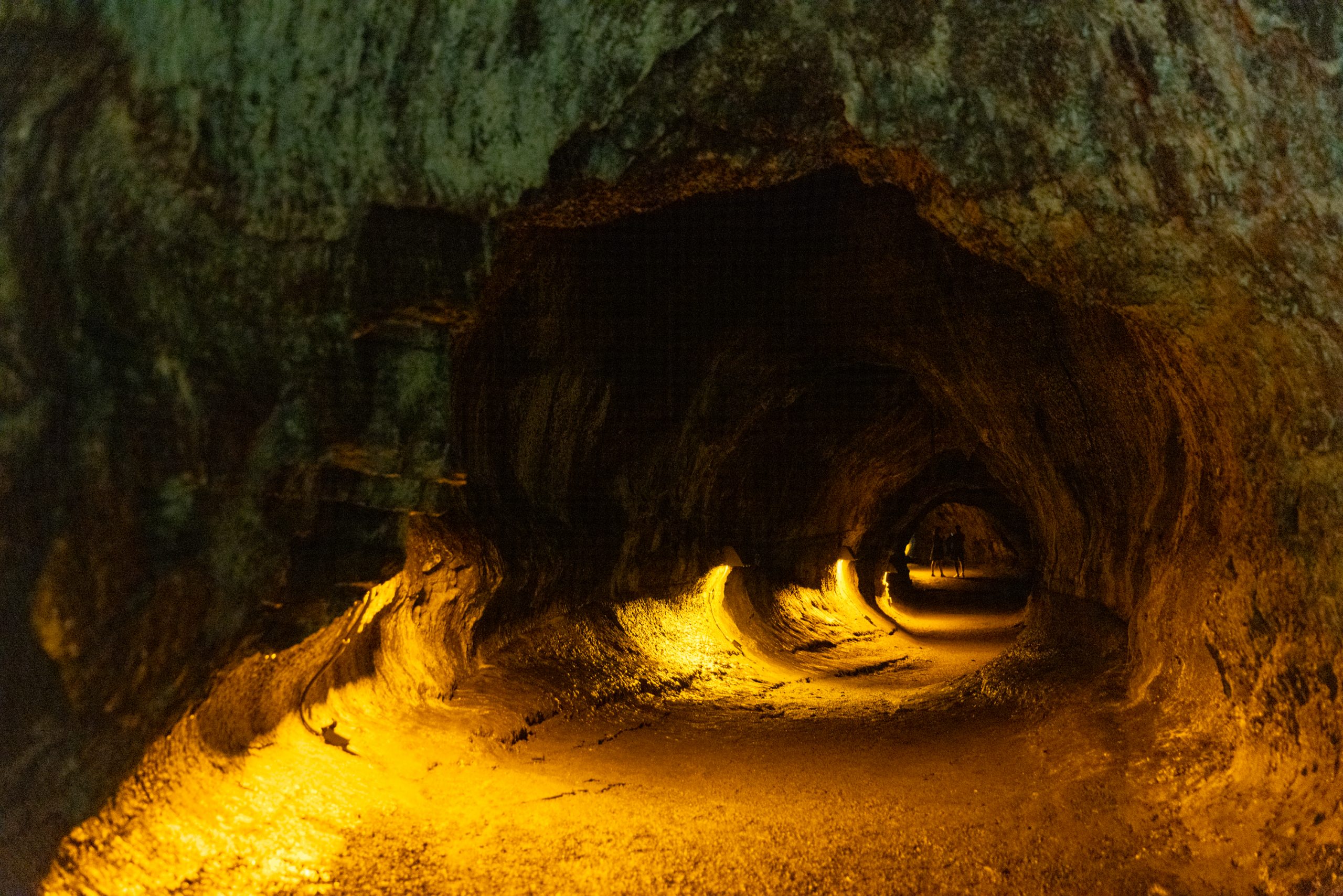 キラウエア・カルデラから車で移動。マイナスイオンを感じる緑が生い茂った道を歩き、500年前にできた溶岩洞窟の中へと入っていきます。暗く天井も低い洞窟の中に入っていく経験はなかなか出来ないもの。洞窟の中は視界が悪く、足元も濡れているため、年配の方は注意が必要です。