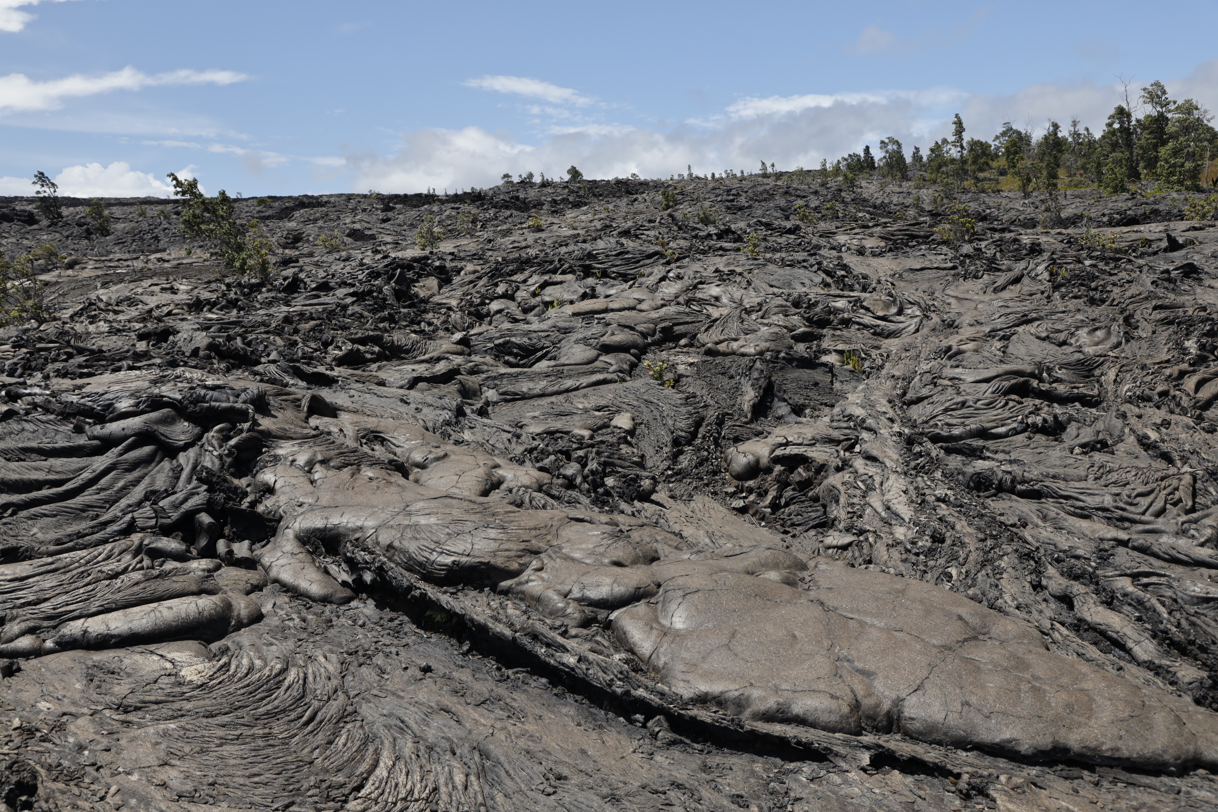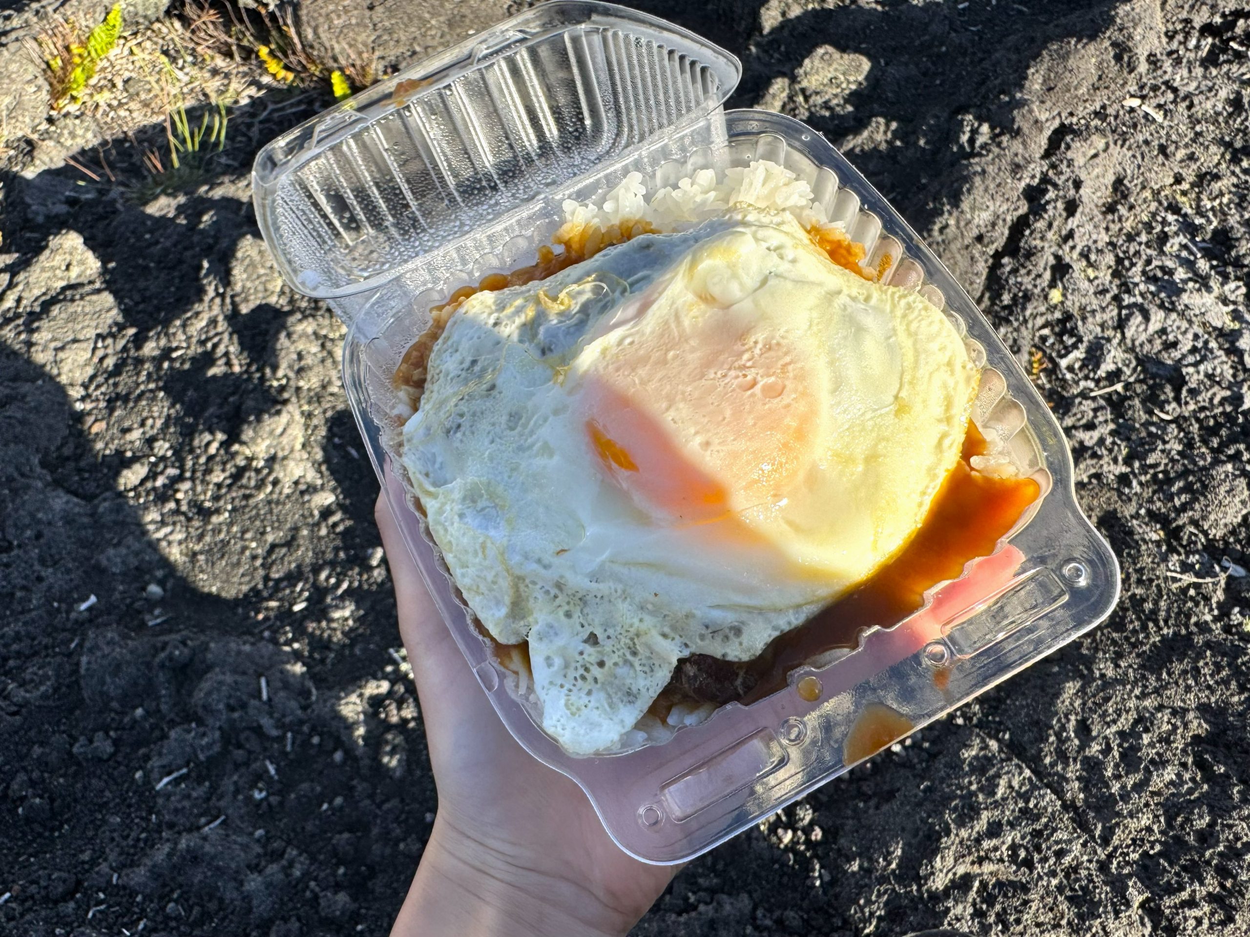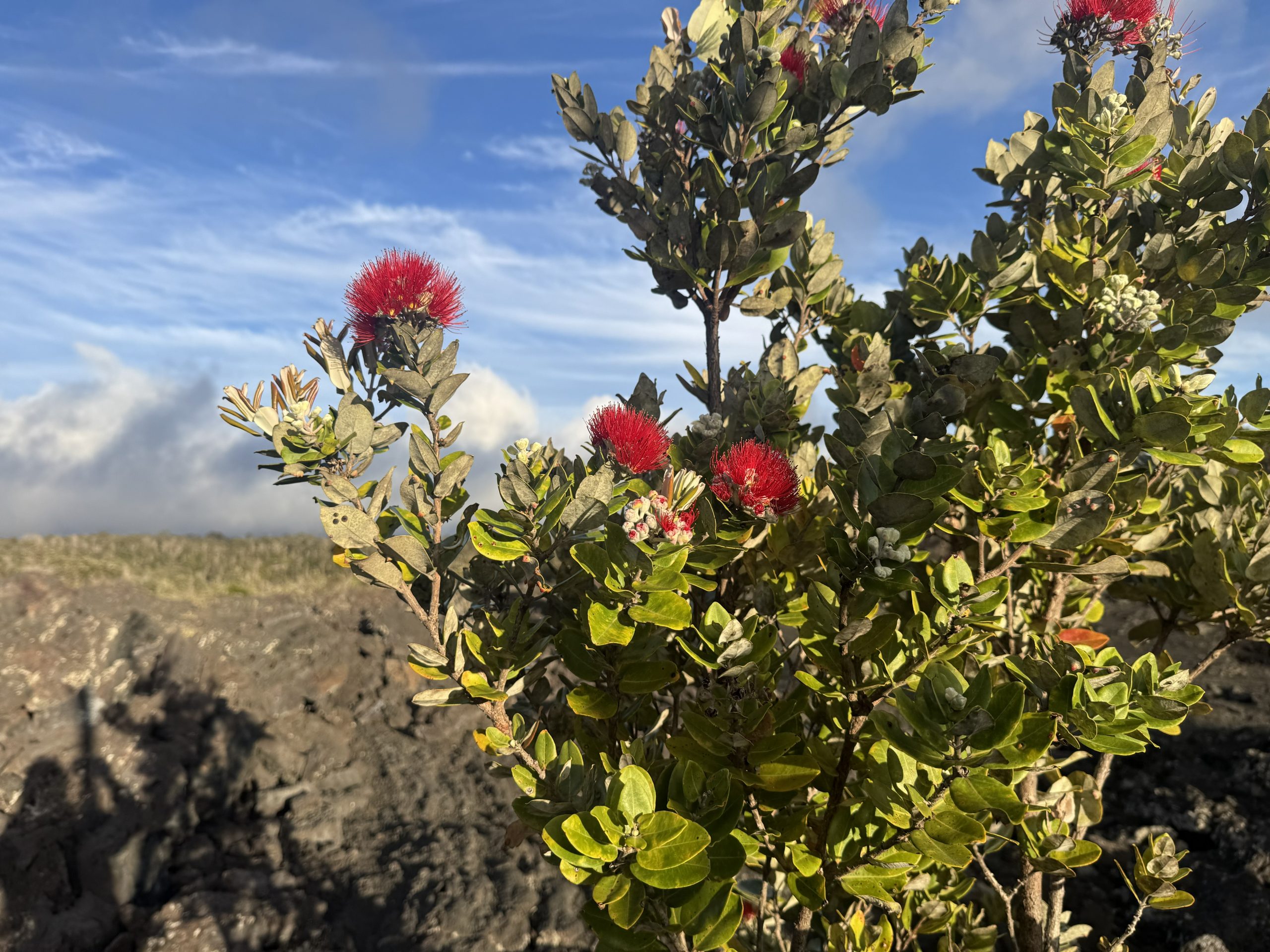 サーストン・ラバ・チューブから、再び車で移動。見渡す限り真っ黒に広がる溶岩台地に足を踏み入れます。溶岩の中で強く美しく咲くオヒアレフアにも注目です。 ガイドがダウンタウン・ヒロで購入してくれていたハワイのローカルフードのお弁当を、溶岩台地でいただきます。このような場所での食事は、忘れられない思い出に。