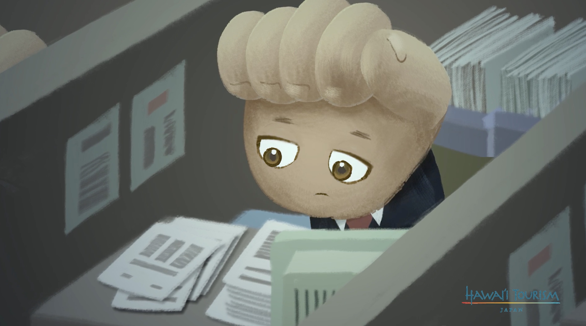 ストーリーは、仕事に追われる日常に疲れたサラリーマンのミスターグー✊が、ハワイへ旅立つところから始まります。