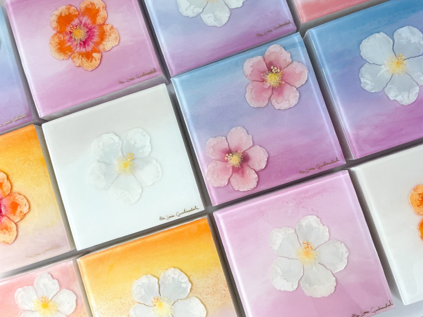 「ハイビスカスは、その美しい花が咲いている時間はたったの1〜2日のみ。その美しい姿を永遠にしたいという思いから、ハイビスカスのコレクションが誕生しました。また、ハワイの空は夢を見ているかのような美しい色で、ハイビスカスが風で空に飛んでいく姿を想像して作品を制作しました。このコレクションを完成させるのに1ヶ月以上かかりました。インクのオーガニックな動きとその美しい色をレジンで閉じ込めたので、一つ一つの作品がワン・オブ・カインド(唯一のもの)になっています」と熱心に語ってくれたアナ・ルシアさんでした。
