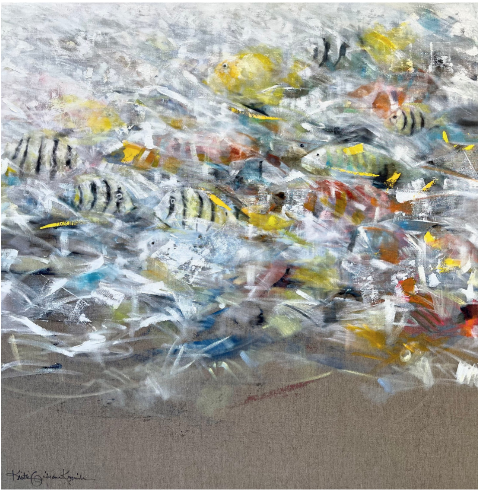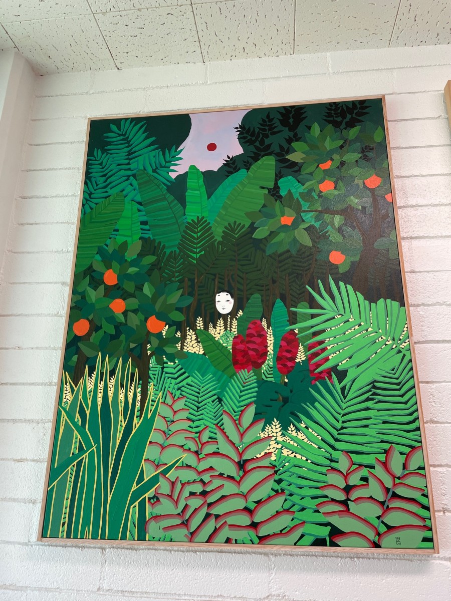 クリスティーさんの作品は主に油絵で、筆の音が聞こえてくるような躍動感のあるストロークや、油絵ならではの美しい色使いが特徴的です。目に見えないエネルギーを作品から感じることができます。ハワイの生活、人々、そして場所からインスピレーションをたくさん受けて、その内なる美を、抽象をメインに具象と組み合わせて表現しています。クリスティーさんは、作品を描く工程について「油絵で大きなスケールで描くのが好きです。真っ白い大きなキャンバスの前にいると、大海の中心にいるような感覚を得ます。孤独で、脆くあると同時に生を感じ、つながりを感じます。そして、インスピレーションと開放感が私の筆を動かしていくのです。この脆くて儚い世界の中で、永遠には続くことのない一瞬を、エネルギーと本質を、探し求めて描くのです」と説明しました。