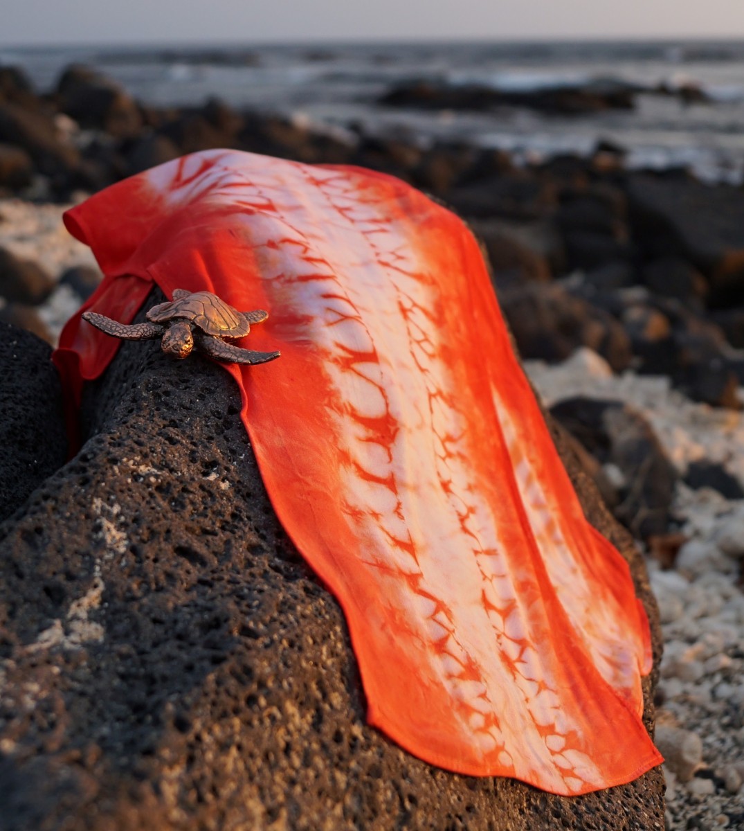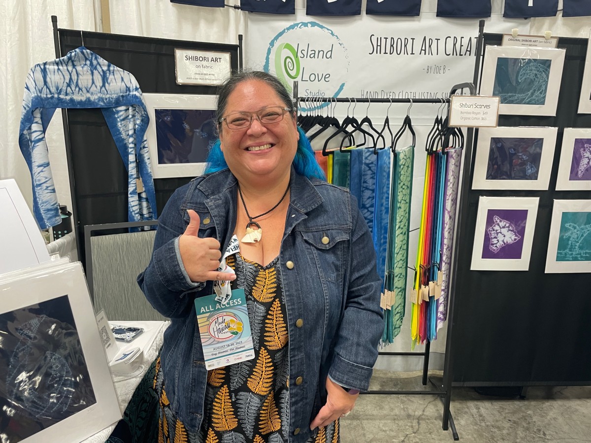 ハワイ島在住のテキスタイルアーティスト、ゾーイ・ブレア(Zoe Blair)さん。2023年8月にホノルルで開催された、ハワイのメーカーやデザイナーたちが一堂に会する一大イベント、メイド・イン・ハワイ・フェスティバルに初出店していたところを発見。日本の絞り染め技術を使って、ハワイの自然や生き物を表現したアートが新鮮でした。