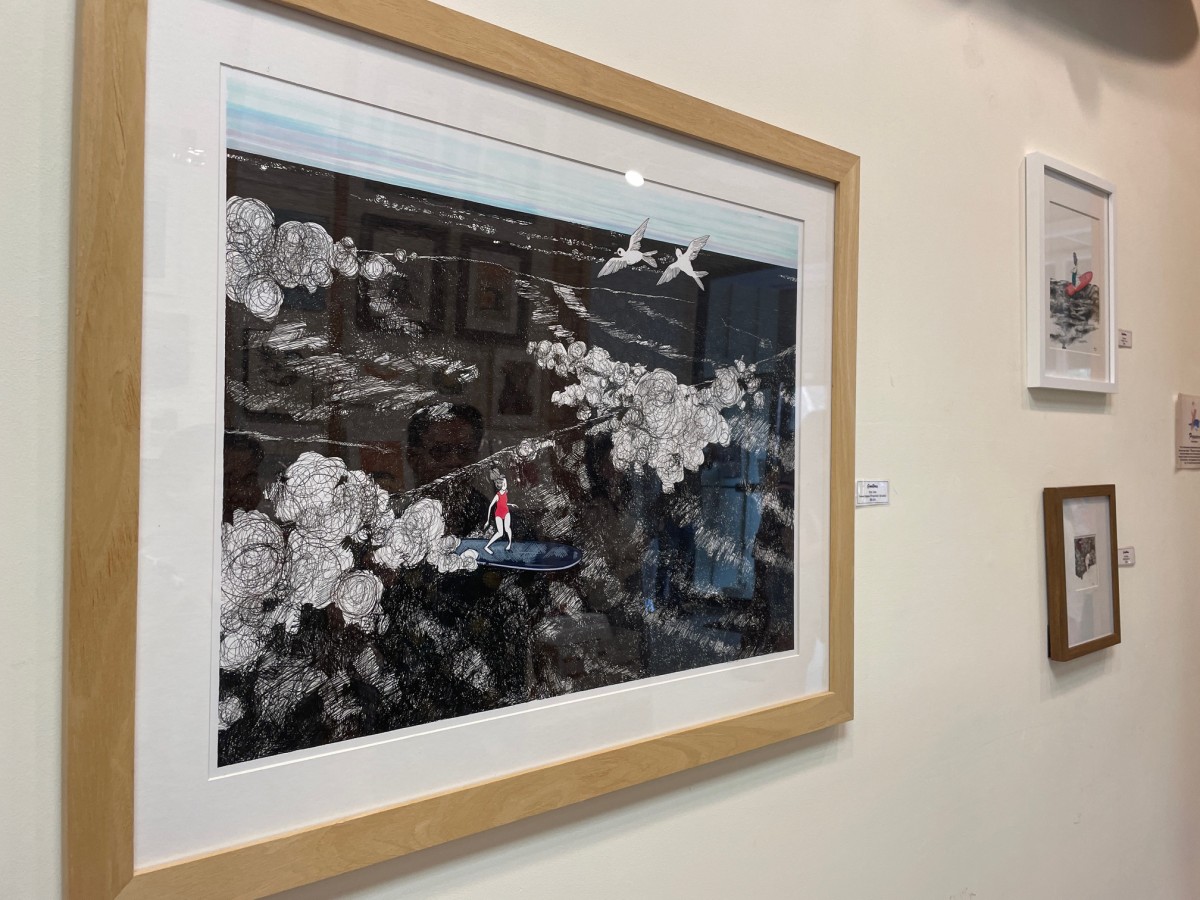 「アートは自分の一部だから、自分が変わるとアートも変わる」と赤裸々に語ってくれました。2024年4月にハレイワタウンのグリーンルーム・ハワイ(Greenroom Hawaii)で行った個展でも、サーフアートもあったものの今までとは違った作品が発表されました。共感性をテーマにしたプロジェクションシリーズの中で、作品「プロジェクション(Projection)」は、真っ黒な海に「ワシャワシャ」とクリスさんが表現するモヤモヤしたアートが描かれています。「自分が置かれている心境で景色も変わる。メンタルで感化されている部分がワシャワシャしていて、ネガティブなマインドで海に癒しを求めても、自分が変わろうと思わなければ変化は起きない」という深いメッセージが込めらえれています。この作品を描いた時はいつもと違うペンの音が聞こえ、新鮮さを覚えたというクリスさん。作品の見た目とは裏腹に、未知の世界に突入してこの作品を描いた日々は楽しい時間だったたそうで、チャレンジをしていきたいという思いの表れでした。ぱっと見何が起きているかわからないアートでも、「わかる!」と思われるもの、人と人とのフィーリングを重視する、まさに共感性をテーマにしたユニークな作品の数々が展示され、多くの人が作品を鑑賞しました。
