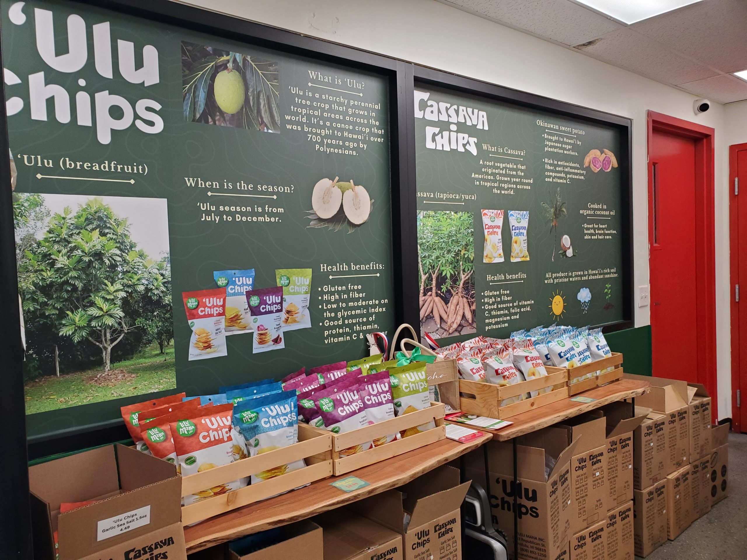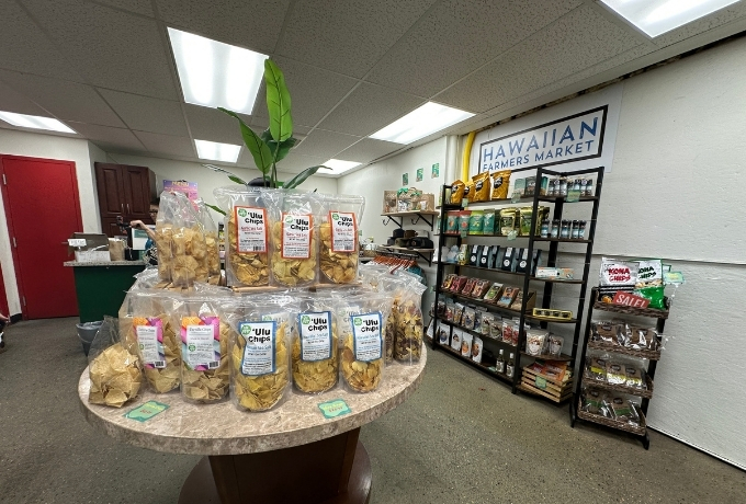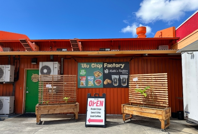 ダイヤモンドベーカリー、ライオンコーヒーから車で約5分の場所に、2つのハワイ産チップスの工場があります。一際目立つオレンジの建物がウルチップスを製造販売する「ウルマナ」。ウルとはパンノキの実で、ハワイではタロと並んで主食として親しまれています。実を蒸してご飯やパンのようにおかずと食べるほか、薄くスライスして揚げたチップスはローカルのおやつとして人気があります。店内にはチップスと一緒に食べたいフムスや、最近仲間入りしたというクッキーも並んでいます。