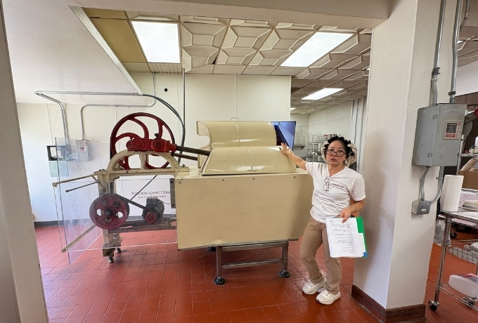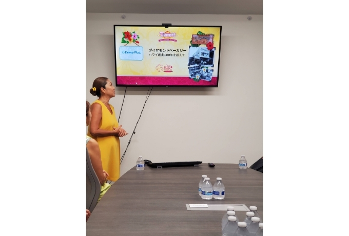 カリヒの工場地帯で一際目立つ黄色い建物が目印。ツアー参加者は工場併設のショップに集合。12名ほどが開始を待っています。まず、会社の歴史を、ガイドさんの説明とともにスライドを見ながら学びます。日本からハワイに渡った移民たちが始めたビジネスはハワイに数多くありますが、ダイヤモンドベーカリーもそのひとつ。