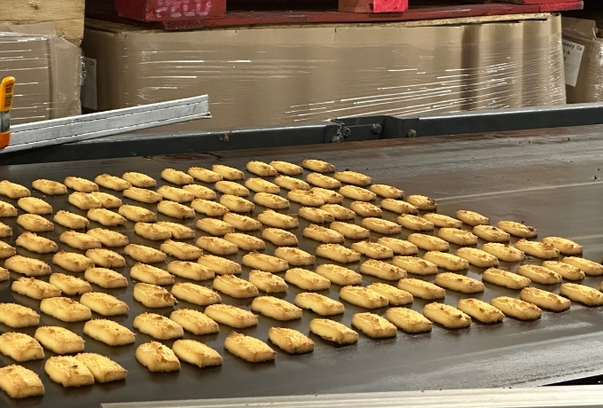 説明を聞いた後は、いよいよ工場内へ。何十メートルも続くベルトコンベアの上に型抜きされたクッキー生地が落ち、ベイクされ、スタッフにより選別されて梱包というプロセスを、順を追って見学していきます。途中、焼きたてのまだ温かいクッキーを試食し、そのフレッシュな味に、ショップでの買い物欲も上がります。