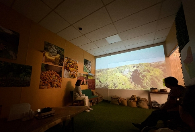 ここで行なわれている工場見学は、まずラウンジにてチョコレートについてのクイズやお話を聞いた後、ロノハナが運営管理するオアフ島ノースショアのカカオ畑のビデオを鑑賞。そもそもカカオがどんな形なのか、生の実を乾いたカカオ豆にするまでの工程を学びます。カカオの生の実の試食もあり、どれだけの手間ひまをかけてチョコレートが出来るのかが、分かってきます。そして工場内へ。チョコレートの甘い香りが広がる工場では、製造工程順に見学していきます。途中、カカオニブ、タイミングが合えば板チョコ前のチョコレートを食べてみることも。ラウンジに戻ったら、今見学した工程を思い浮かべ、チョコレートの風味を感じながら試食を楽しみます。