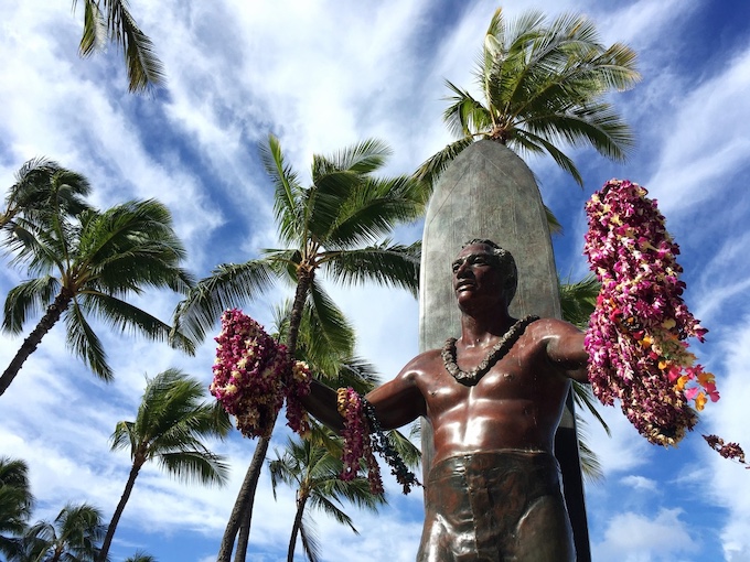 デューク・パオア・カハナモク(1890年生~1968年没)。ハワイの大事な文化の一つ、サーフィンを世界に広めただけでなく、オリンピック金メダリストとして、世界に名を轟かせた伝説の人です。この方が育った地が、現在のヒルトン・ハワイアン・ビレッジのある辺りなのです。