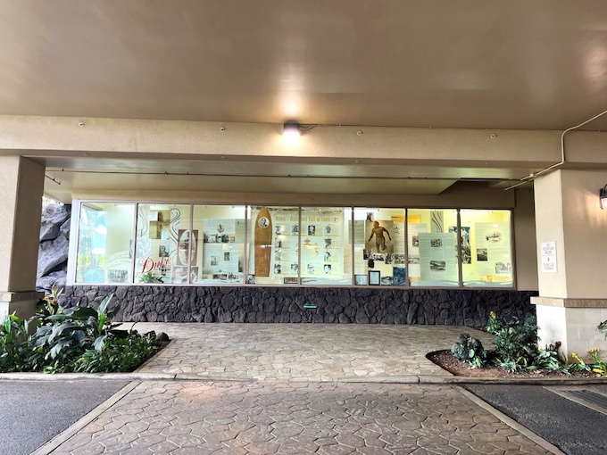 そのような、デューク・カハナモクゆかりの地であるヒルトン・ハワイアン・ビレッジでは、デュークに関する展示も大きく行っています。目立つ場所ではないので、知る人ぞ知る…といった場所かもしれませんが、ぜひ見つけてみてください!このような展示です。