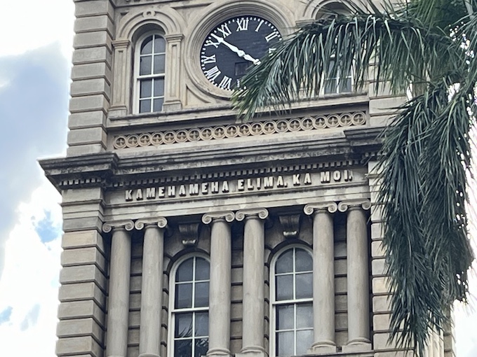 有名なカメハメハ大王像の後ろにそびえ立つ建物は、5世が使う宮殿として設計されたものでしたが、5世の希望により、住まいとしてではなく、議事堂として使う目的に変更され建てられました。しかし残念ながら、完成前に5世がお亡くなりに…。現在は、最高裁判所と、ハワイの裁判の歴史が学べる博物館となっています。正面に付けられた時計の下を見ると、しっかり「KAMEHAMEHA ELIMA, KA MOI.(カメハメハ5世、王様)」と刻まれています。この建物の名前の「アリイオラニ」は、5世の名前の一部です。
