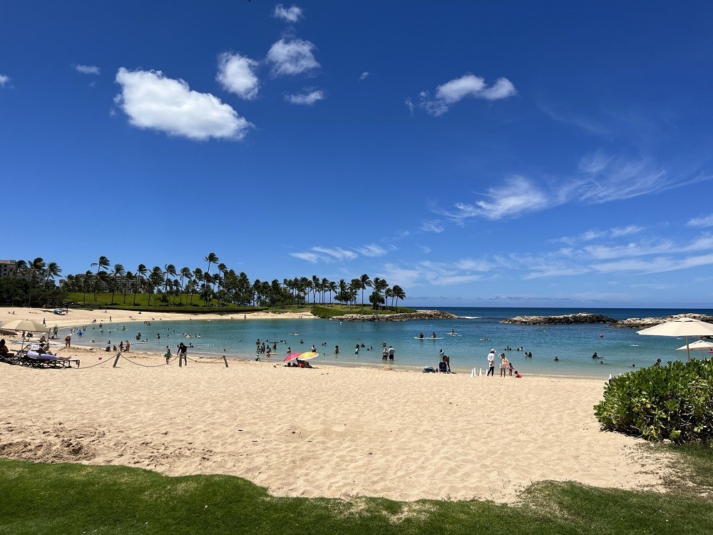 線路との交差点です。オアフ島では現在、高架の上を走る電車の工事が進んでいますが、コオリナを通る線路は100年を超える歴史ある線路で、現在も使われています。踏切の棒がないので、よーく左右を確認して線路を渡りましょう。おめでとうございます!リゾート地「コオリナ」に到着です。巨大なリゾートホテルやコンドミニアムが見えてきますよ。コオリナに現在ある宿泊施設は、「フォーシーズンズ リゾート オアフ アット コオリナ」「アウラニ・ディズニー・リゾート & スパ」「ビーチヴィラズ・アット・コオリナ」「マリオット・コオリナ・ビーチ・クラブ」(書き方は各ウェブサイトの日本語表記に合わせています)。ホテルが密集したワイキキとは違い、どこもゆとりある造り。道を歩いていても、静かでのんびりした雰囲気です。 コオリナには、4つの人工的に造られたラグーンがあり、それぞれがパブリックビーチとなっているので、宿泊客でなくてもラグーンでのひと時を楽しめます。比較的穏やかなコオリナの海は、王族にも好まれた場所でもあります。