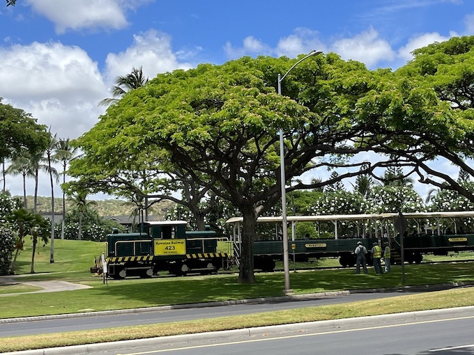 リリウオカラニ女王は、コオリナの辺りまで列車で訪れたのでしょう。ベンジャミン・F・ディリングハムが設立したオアフ・レイルウェイ&ランド・カンパニーが、ホノルルからオアフ島西部を通ってノースショア、さらには北東部のカフクまで線路を伸ばしました。リリウオカラニ女王は列車で、ノースショアにまでよく出掛けていたそうです。線路の一部が残されており、現在、水・土・日に観光列車が走ります。のんびり進む列車は、アイスクリームショップやコンビニ、レストランなどが並ぶ「コオリナ・センター」で一旦停車。コオリナの各リゾートホテルやコンドミニアムから、徒歩でも行ける場所にある便利なショッピングセンターには、線路を堂々と横切って入ります。