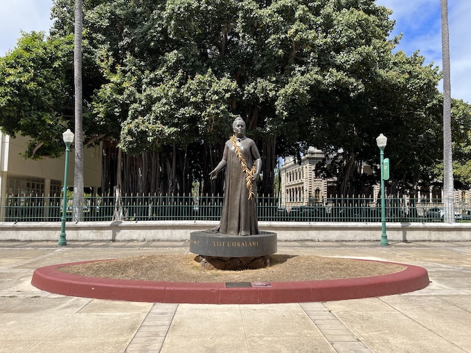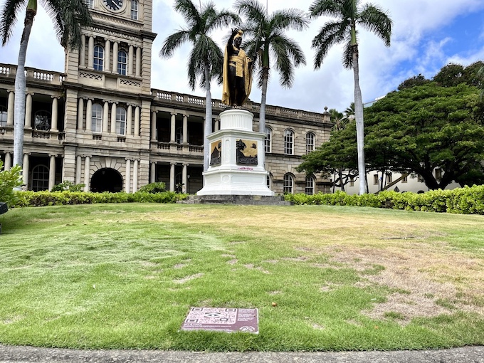 ホノルルのダウンタウンにある2つの銅像の前に行ってみましょう。一つ目は、ハワイ王国最後の女王、リリウオカラニ女王の銅像です。イオラニ宮殿とハワイ州庁舎の間に銅像はあります。王国最後の女王ということもあり、ハワイアンの方々には特別の想いがある銅像で、毎日のように花やレイが置かれていきます。銅像に近づくと、赤紫色のプレートが目に入ります。