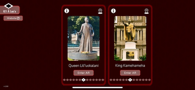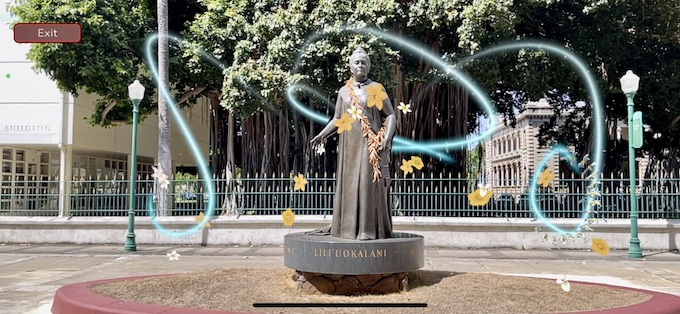 リリウオカラニ女王像の前に到着したら、左側の写真下の「Enter AR」をタップします。そして、銅像前の赤紫色のプレートのQRコードを読み取らせます。「Line frame up to image on ground」と画面に出たら、カメラを銅像に向けてみましょう。すると…銅像の周りに光が漂い、花が舞い降りてきました!画面には、さらに選択ボタンが現れ、それぞれ、数分にまとめられた話を聞くことができます。それらの内容に合わせ、違った画像が登場するので、なかなかな見応え。まるで目の前で話してくれているよう。背丈もおそらく、実物大と思われます。すごい!