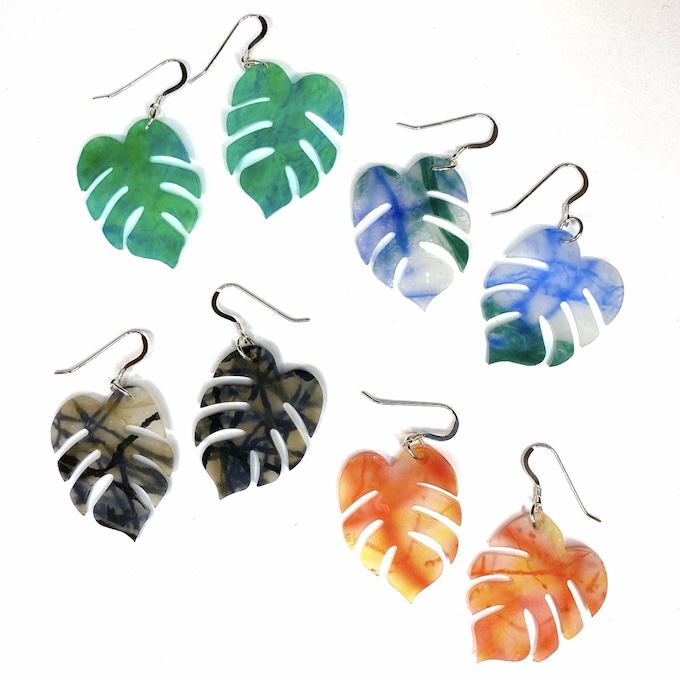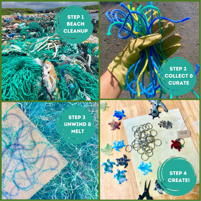 海岸で拾ってくる漁業用の網などは、きれいに洗浄してから繊維状にほぐし、色別に分ける。そして溶かして別のプラスチック素材と重ねていき、キーホルダーやイヤリングへとアップサイクルされます。